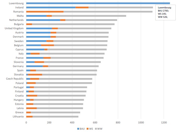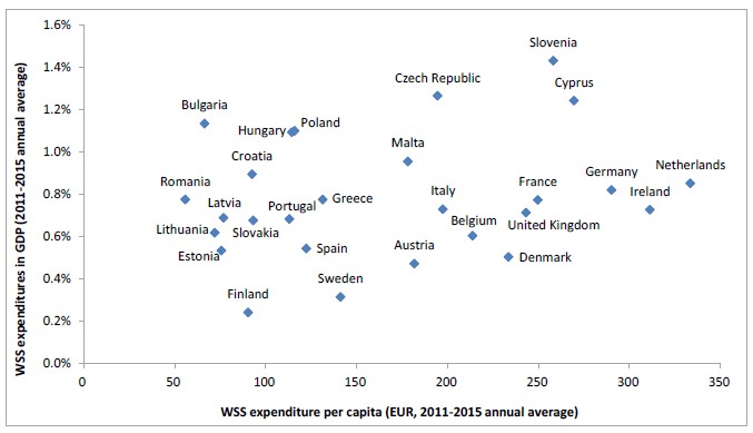 On May 28, 2020, the OECD and the European Commission released a joint study that documents investment needs in member states and takes stock on financing challenges (study). This study contains a set of well-grounded evidences. As a matter of example, the graph below shows the water supply and sanitation expenditures per capita in EU Member states.