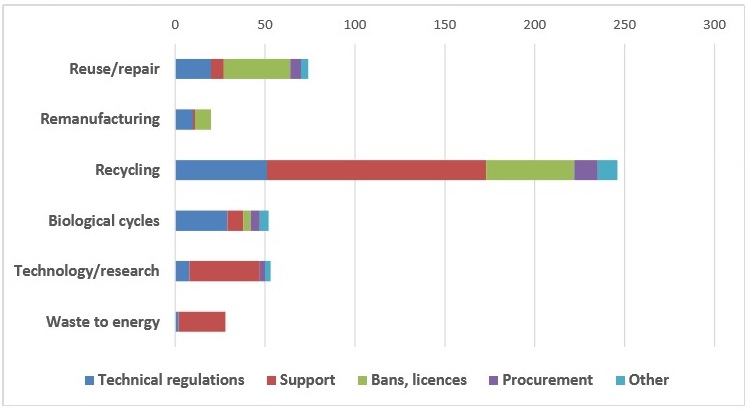 Moreover, a collaborative agenda at the global level that aligns the CE with existing policy priorities around sustainable development and trade cooperation is needed to accelerate the development of circular value chains both in developed and developing countries. Common rules and standards for international circular value chains must be agreed at global level, particularly where they risk displacing traditional workers or are associated with environmental or health risks, as is the case with e-waste. As a matter of illustration, the chart below presents an analysis of the measures notified to the WTO which refer to activities related to the circular economy between 2009 and 2017 (source: Trade policies for a circular economy: learning from WTO experience)