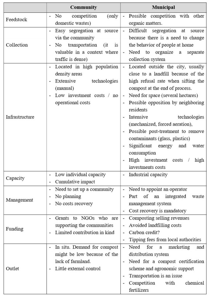 Composting a low-cost and robust technology which can have a significant impact on the volume and the nature of wastes to be landfilled which the product is highly valuable. Its role withing an integrated waste management system in cities cannot be questioned. In this context, however, one should be aware that composting is a crosscutting issue that could be affected by many policies such solid waste management, agriculture, environmental, land-use, and planning. The mind map below tries to spot the main management levers and the risks to face for developing the systems.