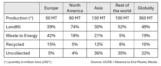 The level of coordination required to achieve the Treaty’s objective is questioned among Member States. Should the UN agree on legally binding global rules and targets, or should it promote approaches that favour national action guided by non-binding targets and guidelines? The first option implies a unified commitment to ambitious, legally binding targets and policies aimed at achieving significant reductions in plastic pollution on a global scale. On the other hand, a more decentralised approach favouring national actions based on non-binding targets may allow for flexibility, but could also lead to different levels of commitment and effectiveness. Some of the issues are related to international trade and others to the local context. The treaty will also need to address regional differences in the collection and treatment of plastic waste, as illustrated in the table below: