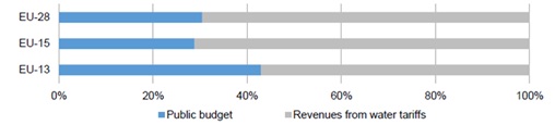Water and sanitation services are generally sourced and provided locally. Consequently, investments are often relatively small-scale and fragmented. Furthermore, pricing services is a complex issue. A matrix of factors, including affordability, human rights, political expediency and social acceptance, often combine to make future inflows for water infrastructure assets less predictable than in other sectors. In most cases, utilities do not collect enough revenue through tariffs to cover operational and capital costs. The chart below illustrates the financing sources for water supply and sanitation services in the EU28, based on the average for the period 2011–2015 (source OECD / Eurostat).